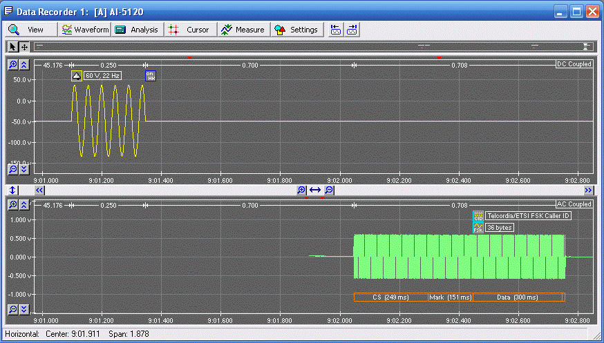 1. Caller ID transmission starting with RP-AS (ring pulse alerting signal) captured by the DC coupled channel, followed by the FSK signal captured with the AC coupled channel. Note that the annotations shown underneath the FSK signal are generated by the Waveform Analysis option.